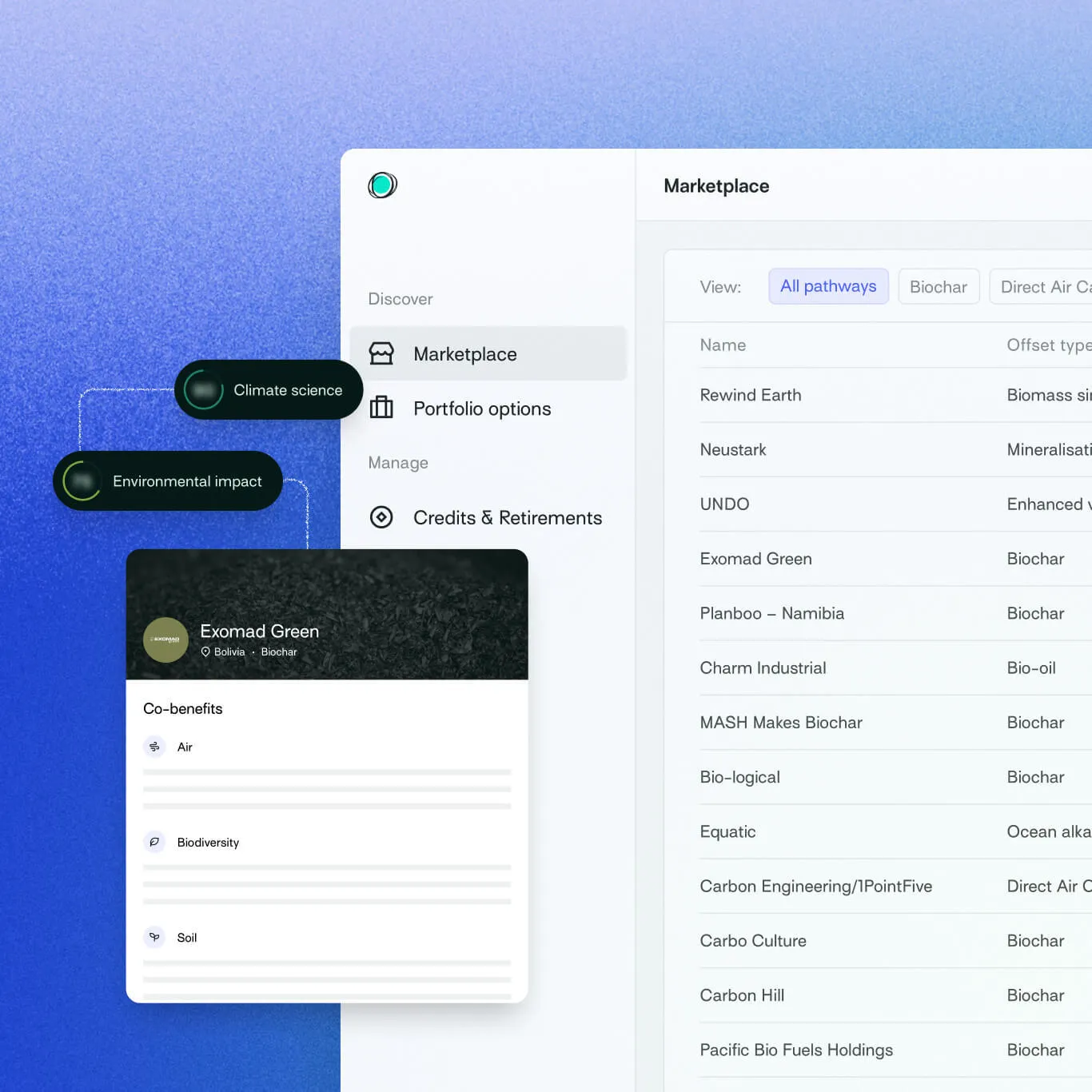 We find the best projects, co-develop new ones from scratch, and secure exclusive access. We hold three-year exclusive distribution of Exomad Green, the world's #1 biochar project. We partnered with Liferaft to deliver a signed 1M tonne offtake in half the typical time. When the right supply doesn't exist, we create it.